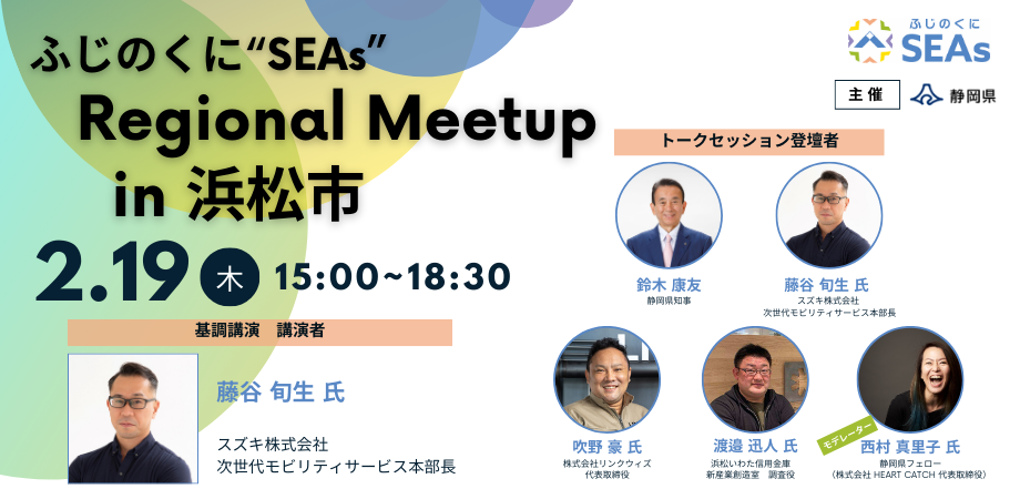 この度2/19(木)15:00~18:30にてスタートアップイベント「ふじのくに”SEAs” Regional Meetup in 浜松市」を開催することとなりました。付きましては皆さまへご参…