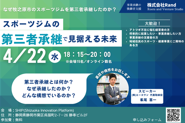 日時:4月22日(水)18:15~20:00 会場:SHIP 定員:15名(会場)、数名(オンライン) 参加費:無料 <内容> 地域にとって必要な会社が、いかに存続していくか。 …