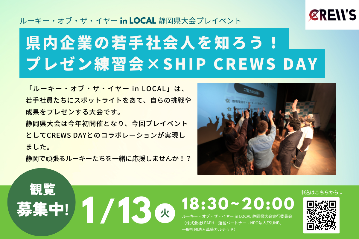 ルーキー・オブ・ザ・イヤー in LOCAL 静岡県大会 プレイベント開催のご案内 この度は、プレイベントへのご関心を寄せいただきありがとうございます。本大会に登壇する若手社員たちのプレゼンを一足早く聞ける、貴重なチャンスです。本番に向けて全力でブラッシュアップに励むルーキーたちを応援したい方、どんな若手が活躍しているのか気になる方、ぜひ会場でルーキーたちの挑戦を見届けてください!《イベント概要》【日程】2026年1月13日(火)【時間】18:30~20:00(受付開始:18:00~)【会場】SHIP(静岡県静岡市葵区呉服町2丁目7−26 静専ビル2F)《タイムテーブル》18:00~ 受付18:30~ 挨拶/チェックイン18:35~ 大会概要説明&経験談共有18:45~ プレゼンプチ講習18:55~ ワーク説明19:00~ 登壇者プレゼン:ひとり5分+フィードバックタイム1分19:40~ 事務局より挨拶19:45~ 質問/交流タイム19:55~ クローズ(撤収)※変更になる可能性がございます【注意点】・大会当日プレゼンの審査を行うため、内容に関して口外しないようお願い致します。・登壇者の上長も参加される場合は、お手数ですがお一人ずつ申込ください。