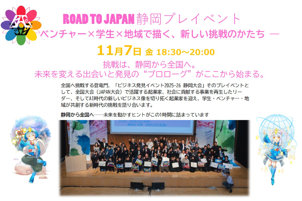 ROAD TO JAPAN 静岡プレイベント ― ベンチャー×学生×地域で描く、新しい挑戦のかたち ― 挑戦は、静岡から全国へ。 未来を変える出会いと発見の“プロローグ”がここから始まる。