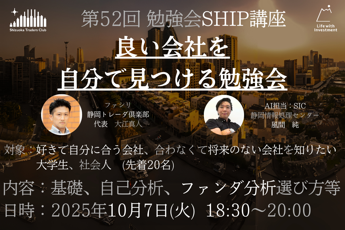 日時:10月7日(火)18:30~20:00 会場:SHIP 定員:20名 参加費:無料 <内容> 「良い会社」とは?「自分に合う会社」とは?大学生や社会人にとって、企業選びは人…