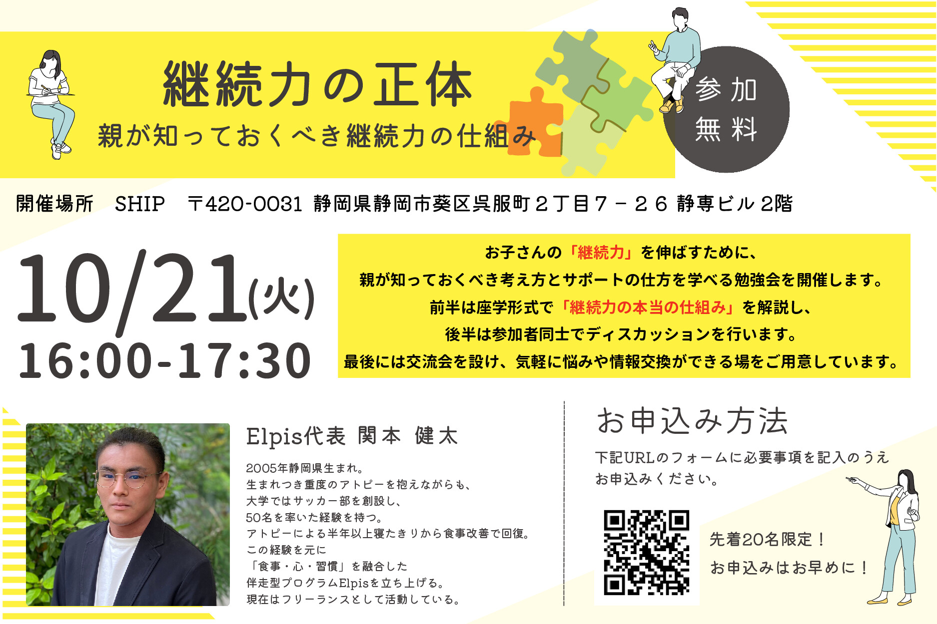 日時:10月21日(火)16:00~17:30 会場:SHIP 定員:20名 参加費:無料 <内容> お子さんの「継続力」を伸ばすために、親が知っておくべき考え方とサポートの仕方…