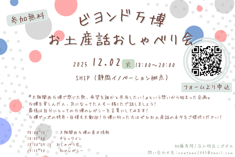 【イベント概要】 日時:12月2日 (火) 18:00~20:00 会場:SHIP 定員:20名 参加費:無料 <内容> 「大阪・関西万博で感じた熱や希望を、誰かと共有した…