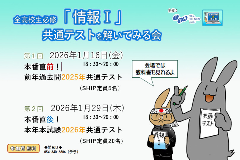 日時:第1回 2026/1/16(金) 18:30~20:00 第2回 2026/1/29(木) 18:30~20:00 場所:「SHIP」または「ちょビット☆ITラボ(静岡市清水区草薙1…